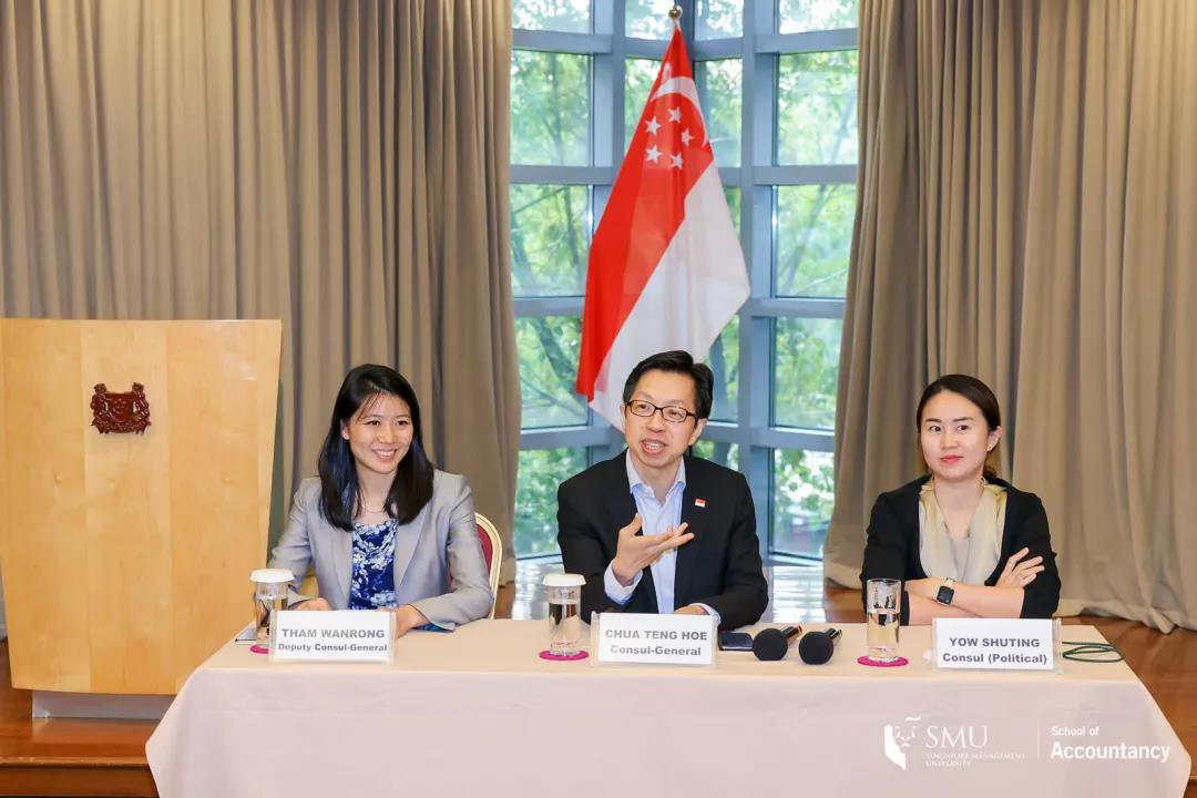 10月14日下午,所有学员刚到达上海便马不停蹄地前往新加坡驻沪总领事馆进行参观交流。蔡簦合总领事、谭宛榕副总领事及领馆工作人员热情地迎接了同学们,并就中新两国关系、经济和文化等同学们感兴趣的话题进行了真挚的交流。领事馆还精心为同学们准备了新加坡风味的美食点心,弥补了疫情期间同学们无法前来新加坡学习体验的遗憾。